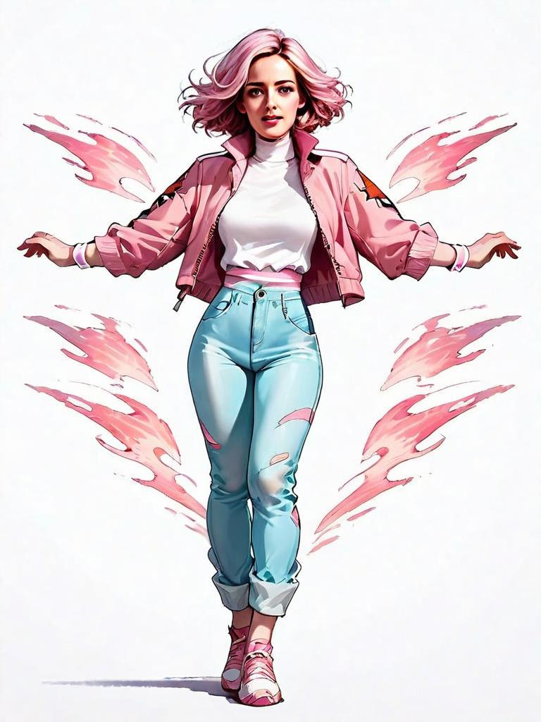 This vibrant digital artwork features a woman with pink hair styled in soft waves, dressed in a casual yet trendy outfit consisting of a pink jacket, white turtleneck, and light blue ripped jeans. The illustration combines realistic face detailing with a comic-style full-body portrayal, highlighted by dynamic pink flame-like accents surrounding her that add a sense of movement and energy.
