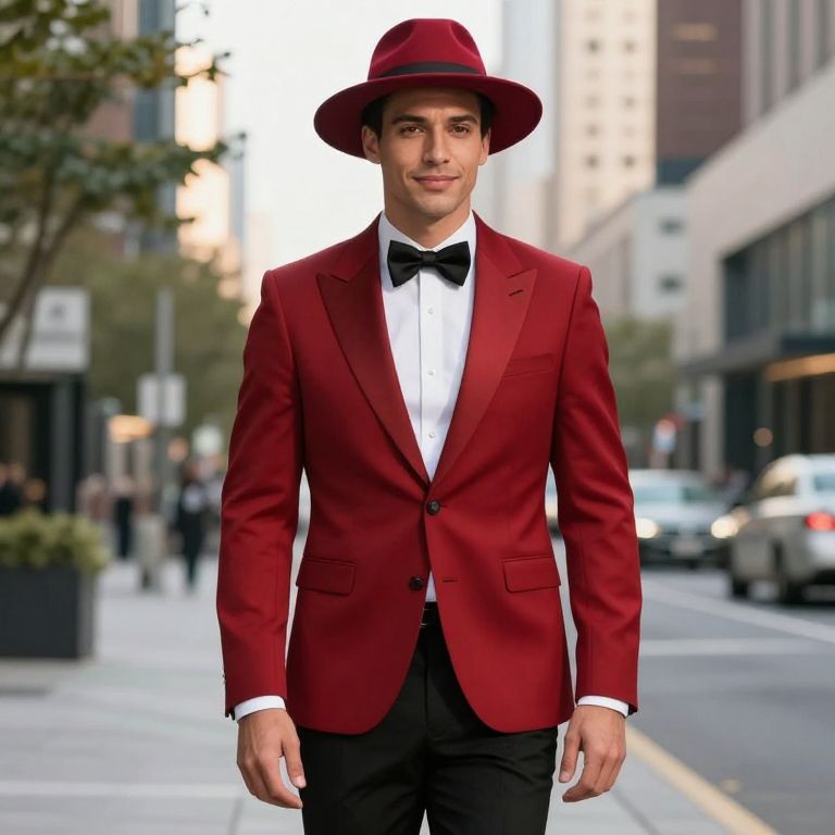 A confident man walks down an urban street wearing a striking red suit jacket paired with a matching red fedora, complemented by a classic white shirt and black bow tie. The modern cityscape background highlights his stylish and sophisticated look, blending contemporary fashion with a touch of vintage flair.