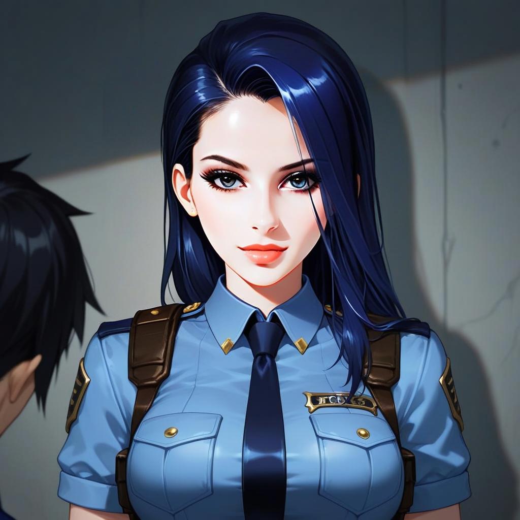 This digital illustration features a confident woman dressed in a detailed police uniform, characterized by her striking blue hair and captivating blue eyes. Rendered in a vibrant, semi-realistic anime style, the artwork highlights intricate shading and sharp linework that bring the character's expressive face and attire to life.