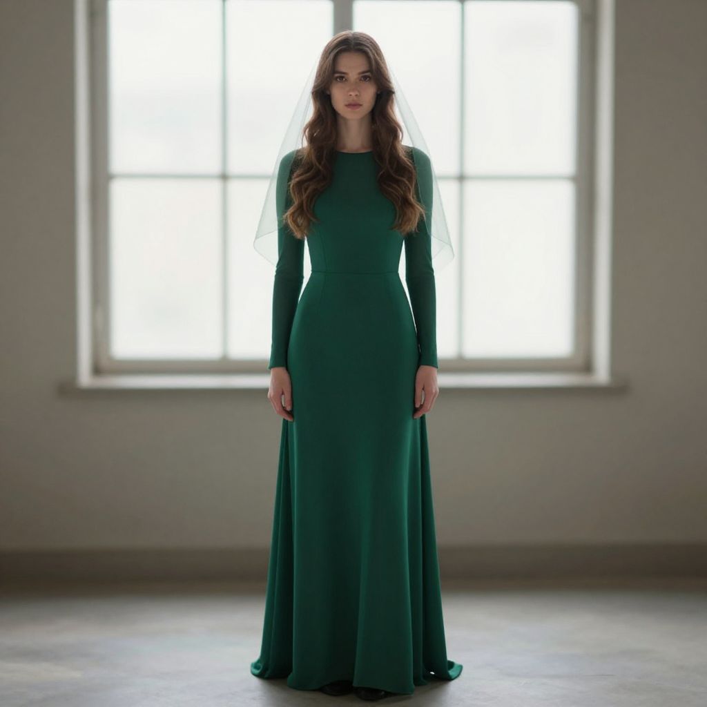 Elegant Woman in Emerald Green Long Sleeve Gown with Bridal Veil