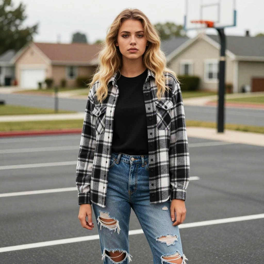 A young woman with wavy blonde hair stands confidently on an empty outdoor basketball court, wearing a black t-shirt underneath a black-and-white plaid flannel shirt. She complements her casual look with high-waisted, ripped blue jeans, embodying a laid-back, modern Gen Z style.