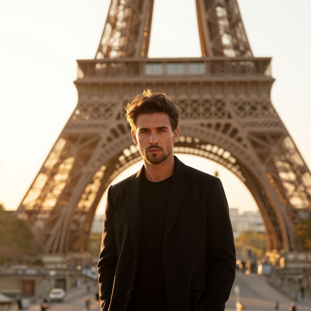A stylish man stands confidently in front of the Eiffel Tower during golden hour, dressed in a sleek black jacket that contrasts with the warm tones of the iconic Parisian landmark. The soft natural lighting enhances the mood, capturing a modern yet timeless moment in the heart of Paris.