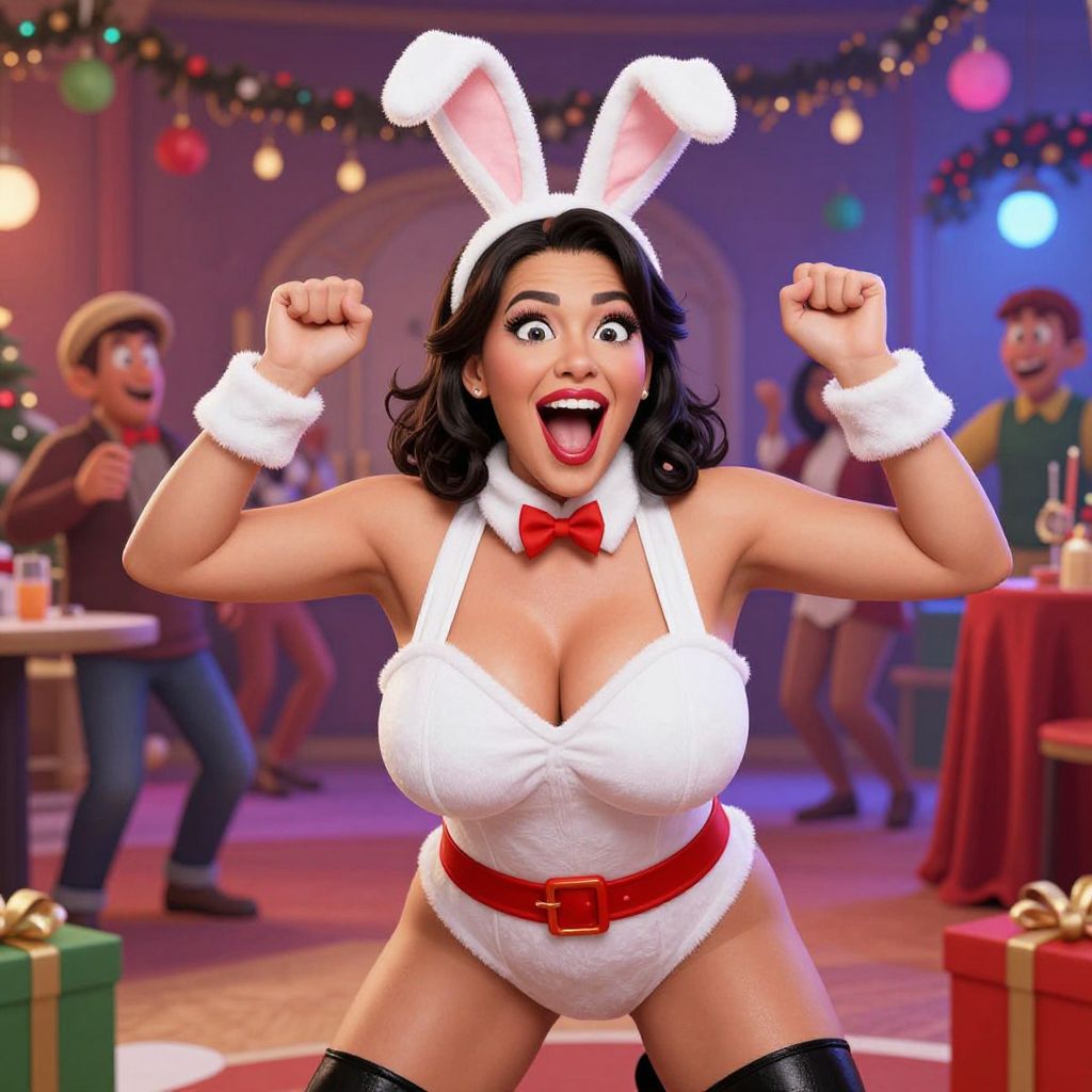 A joyful woman dressed in a playful white bunny costume with a red bow tie and belt poses energetically at a lively holiday party. The festive background features colorful ornaments, string lights, and guests enjoying the celebration, creating a vibrant and cheerful atmosphere. The image captures a fun, whimsical moment with a strong pop art or hyper-realistic 3D illustration style.