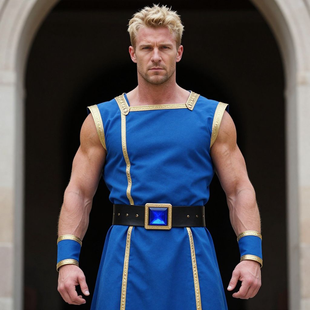A muscular man dressed in a blue and gold ancient warrior costume stands confidently in front of an arched doorway. His outfit features a sleeveless tunic with gold trim and matching wristbands, accompanied by a black belt with a prominent blue gem buckle. The setting and attire give a strong impression of a classical or mythological hero.