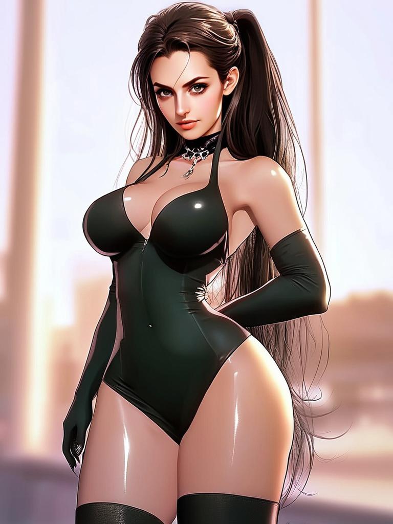 This vibrant digital illustration features a confident woman with long dark hair styled in a ponytail. She is dressed in a sleek black outfit that accentuates her form, set against a softly blurred background that enhances the modern aesthetic of the artwork.