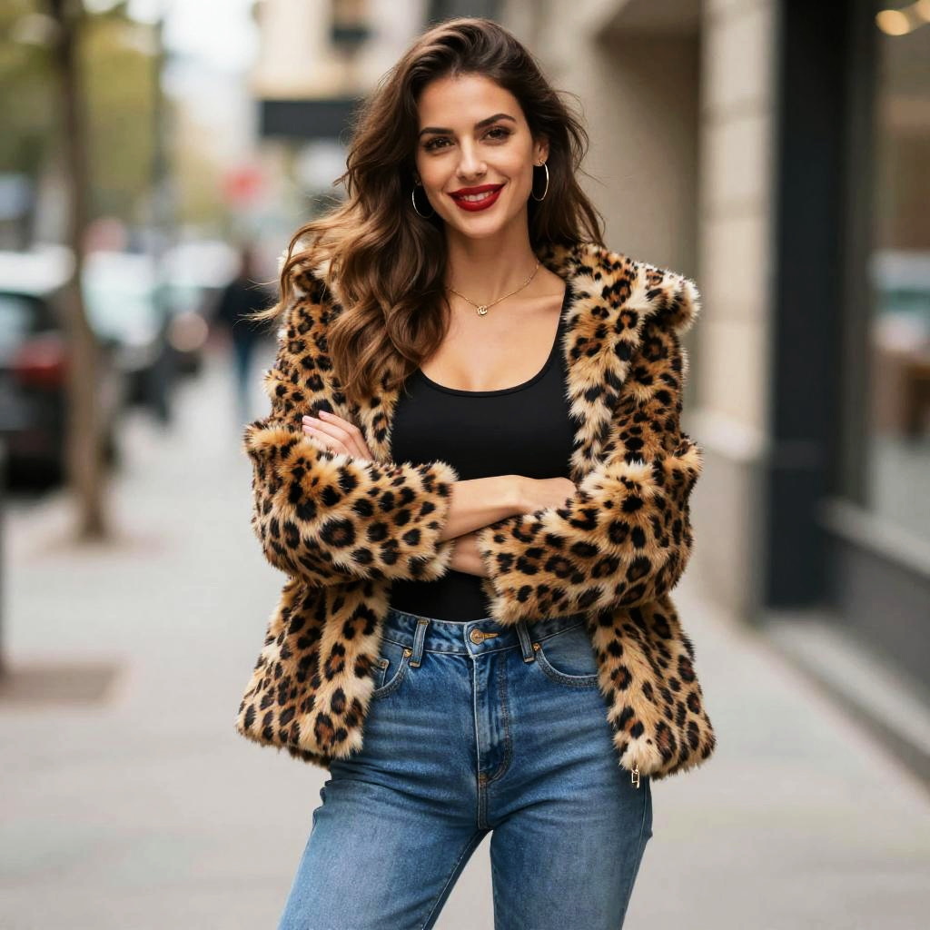 A confident young woman stands on a city street wearing a stylish leopard print faux fur coat over a black top and high-waisted blue jeans. Her wavy hair flows loosely, complemented by hoop earrings and bold red lipstick, creating a chic urban fashion look.