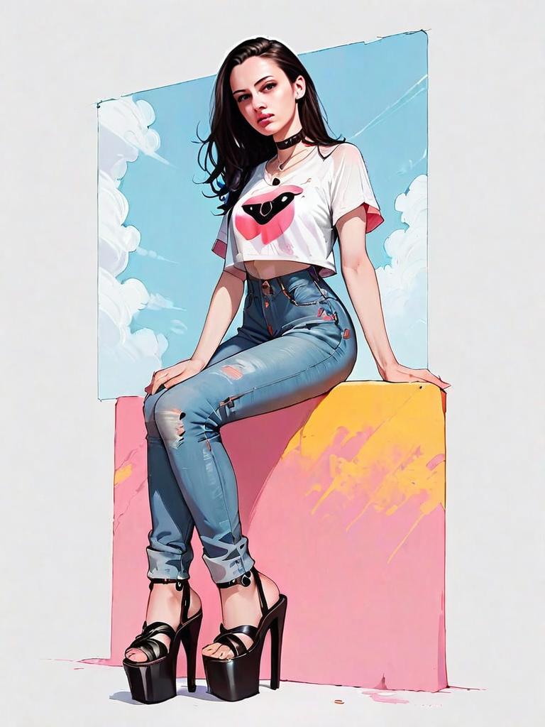 A stylized digital illustration of a woman in casual attire, featuring a white crop top with a bold graphic and high-waisted ripped jeans. She is seated against a vibrant pink and yellow block, with a clear blue sky and clouds backdrop, showcasing a blend of realistic and comic art styles.