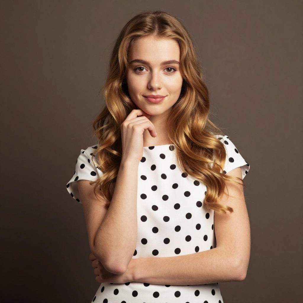 A young woman with long wavy blonde hair poses confidently against a plain brown background. She wears a white dress adorned with black polka dots, exuding a classic, timeless style with a modern twist.