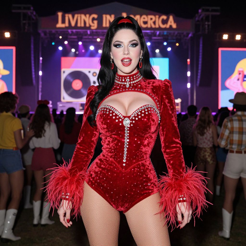 Woman in Red Velvet Rhinestone Bodysuit at Living in America Night Event