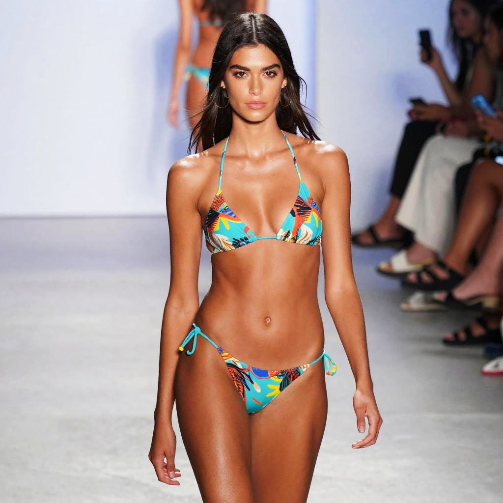 Gen Z Woman Modeling Colorful Tropical Bikini on Runway