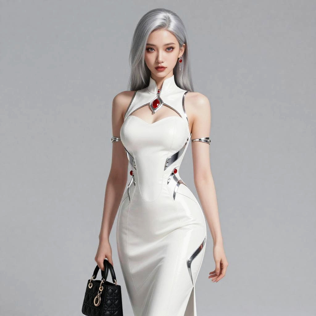 A stylish woman with silver hair wears a futuristic white dress adorned with metallic accents and red gemstones, exuding a modern Gen Z fashion vibe. She carries a black handbag, standing confidently against a neutral gray background in a sleek, minimalistic style.