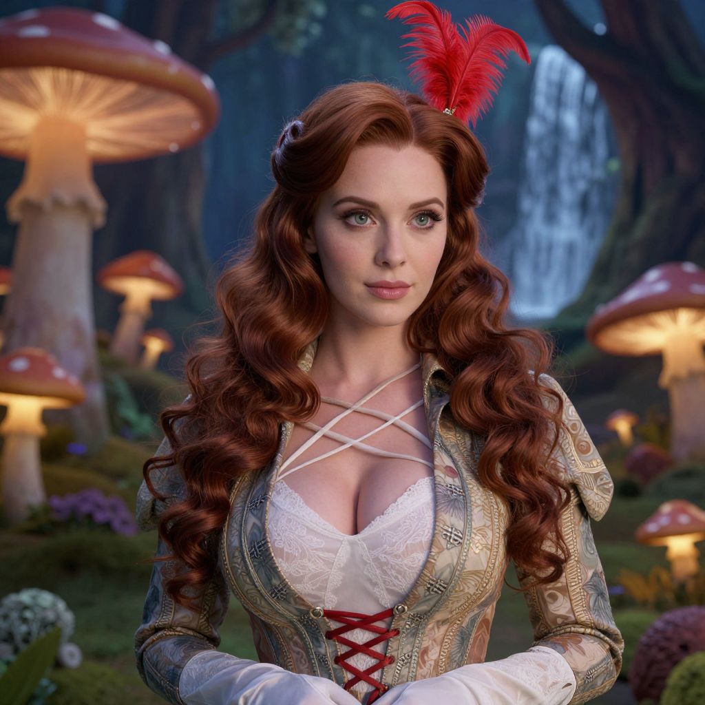 A woman with long, wavy red hair dressed in an elaborate Renaissance-style costume stands amidst a magical forest setting with oversized glowing mushrooms and a cascading waterfall in the background. She wears a corset with intricate patterns, delicate lace, and a red feather adornment in her hair, evoking a fantasy or fairy tale atmosphere.