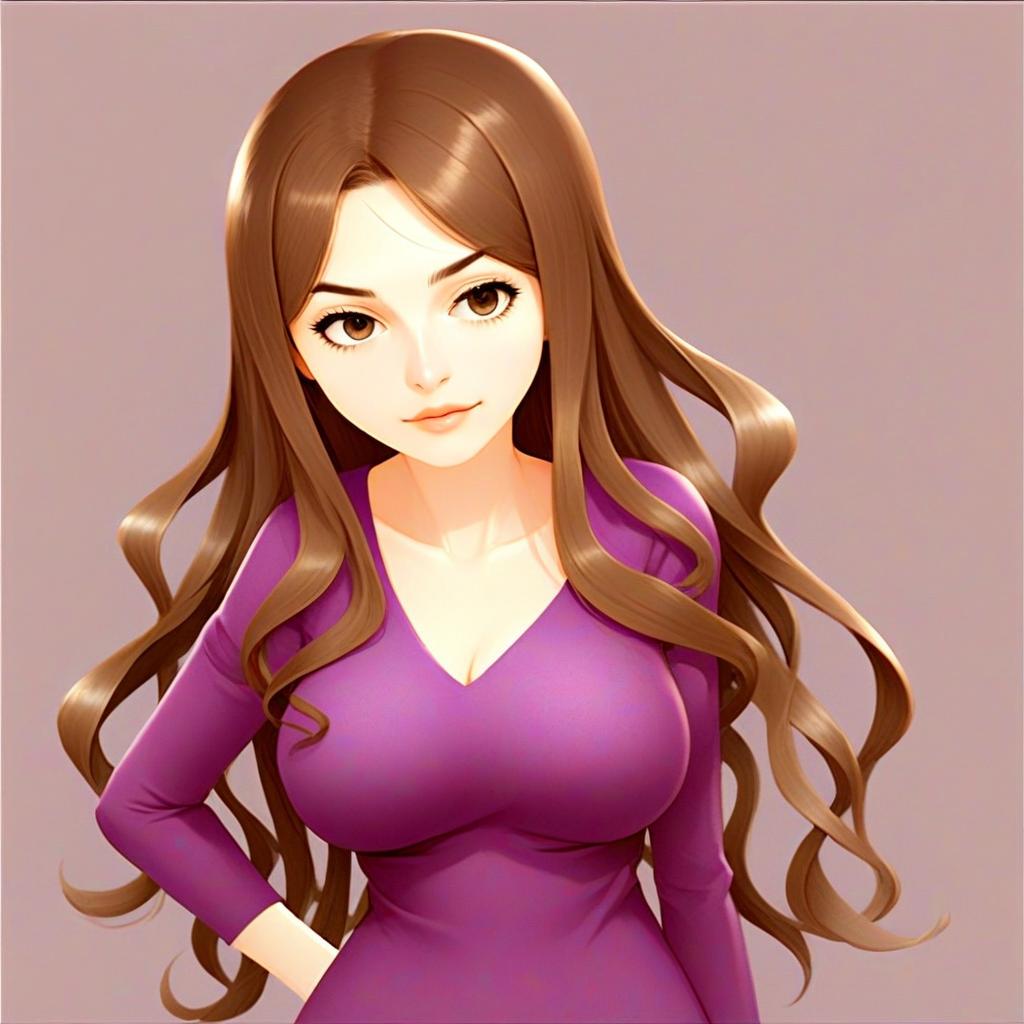 Stylized Anime Woman with Long Brown Hair in Purple Top