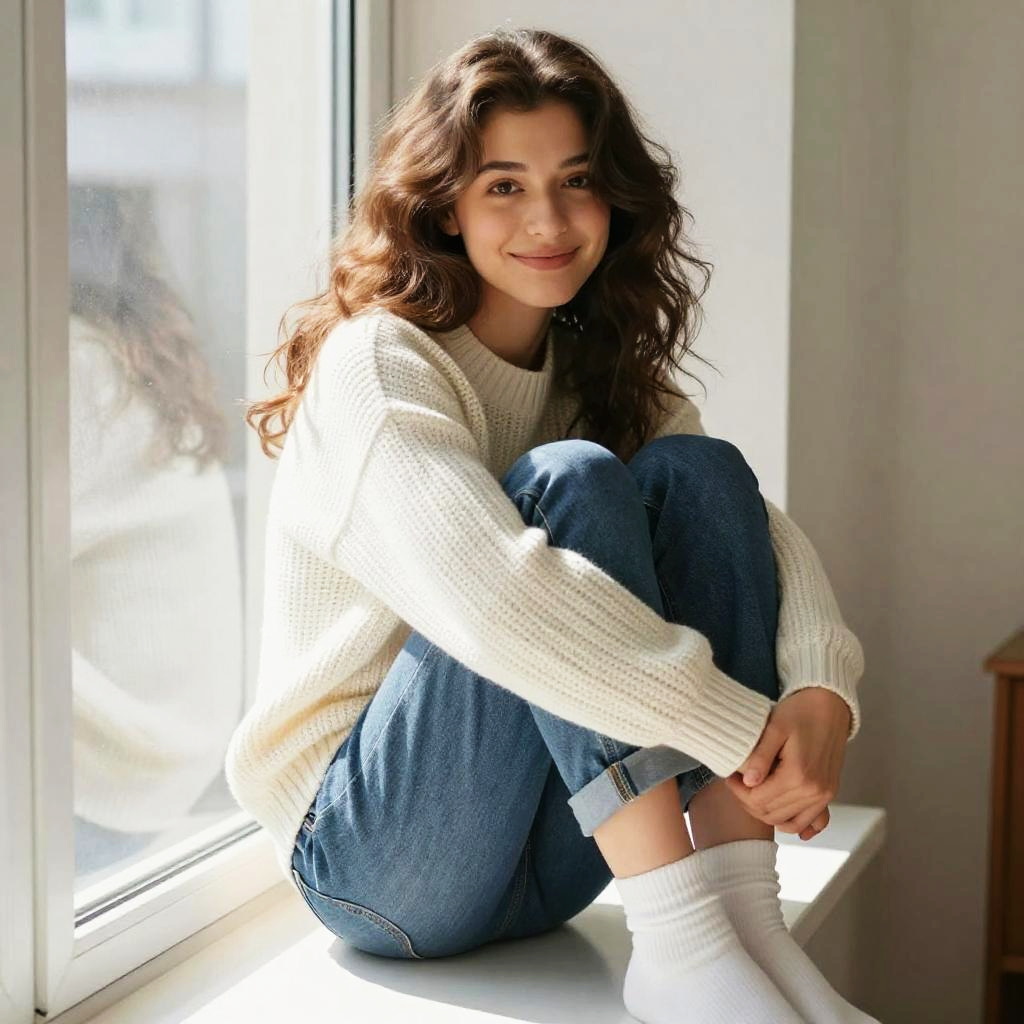 A young woman with wavy brown hair sits comfortably by a large window, dressed in a cozy white knit sweater and blue jeans. She smiles gently, creating a warm and inviting atmosphere in the natural light. The casual indoor setting emphasizes a relaxed and serene mood.