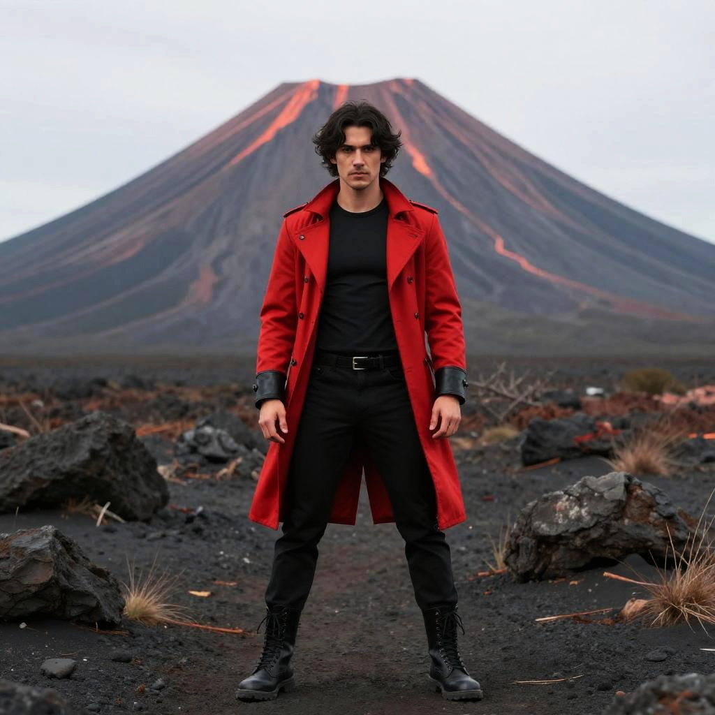 A man dressed in a striking red trench coat and black outfit stands confidently in front of a volcanic landscape. The rugged terrain and the lava streams on the volcano create a dramatic backdrop, enhancing the bold and stylish appearance of the man.