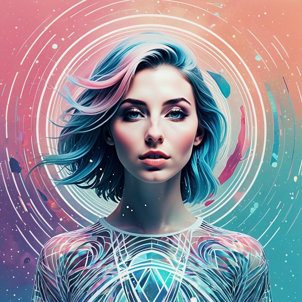 Digital Portrait of Woman with Pastel Hair and Cosmic Geometric Background