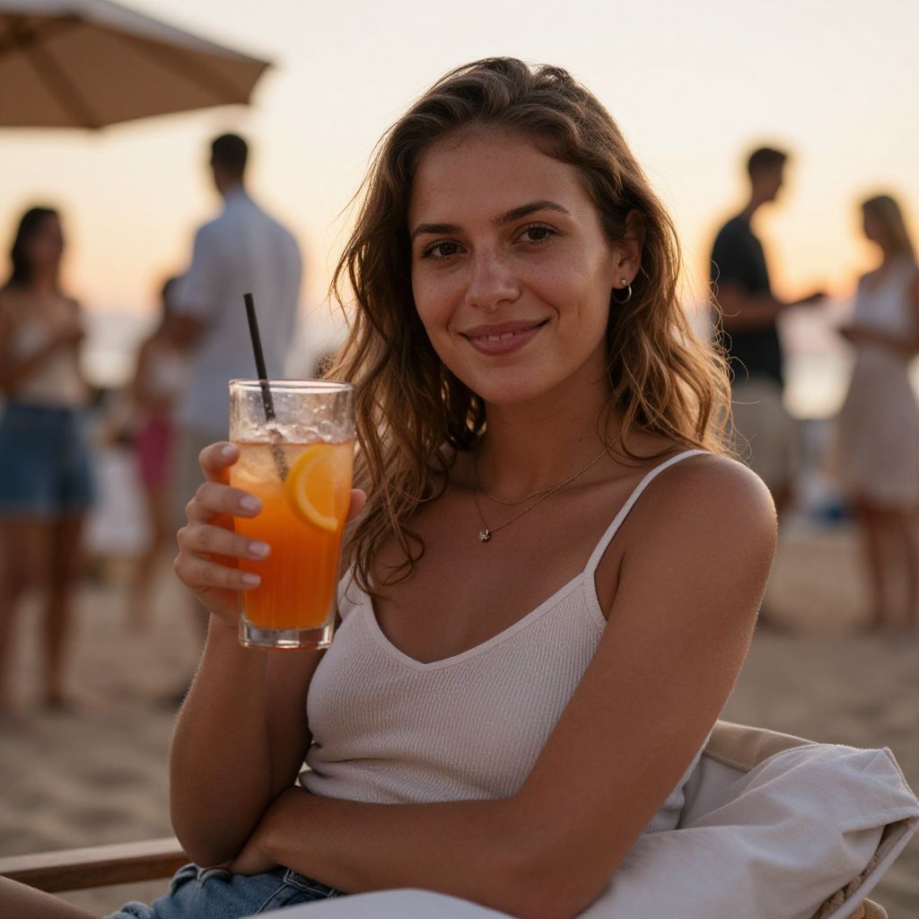 A young woman enjoying a refreshing orange drink at a beachside gathering during sunset. The warm golden hour lighting highlights her natural smile and casual summer outfit, creating a relaxed and joyful atmosphere.