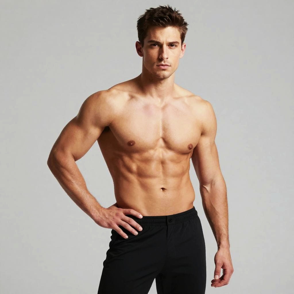 A well-defined shirtless young man stands confidently with one hand on his hip, showcasing a muscular and toned upper body. The plain background and minimal clothing emphasize his physique, making it suitable for fitness, health, or lifestyle themes.