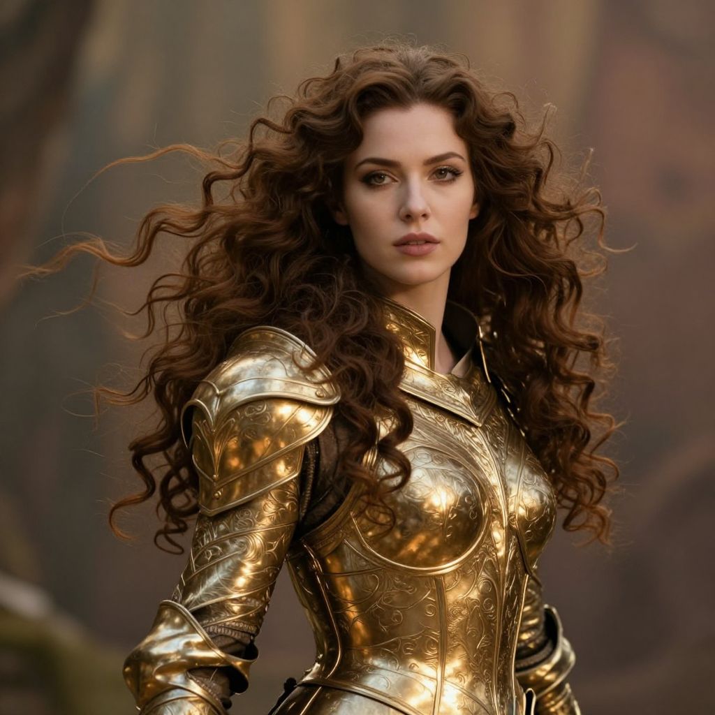 A striking woman with long, flowing curly hair is dressed in ornate golden medieval-style armor, exuding strength and elegance. The detailed craftsmanship of the armor highlights a fantasy or historical theme, complemented by her confident and composed expression.