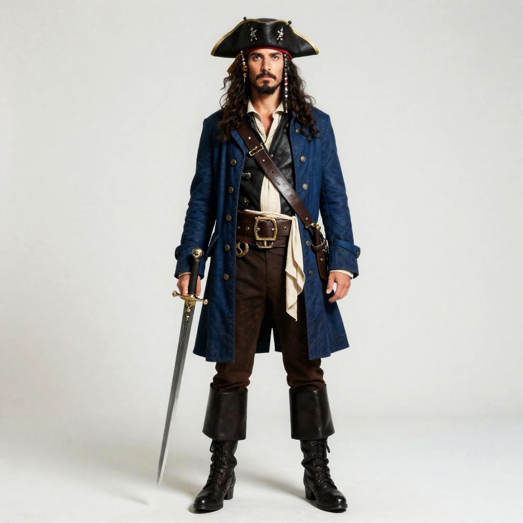A man dressed as a classic pirate stands confidently against a plain background, wearing a distinctive blue coat, a tricorne hat adorned with details, and holding a sword. His costume blends historical pirate aesthetics with cinematic flair, complete with boots, belts, and accessories creating an authentic pirate look.