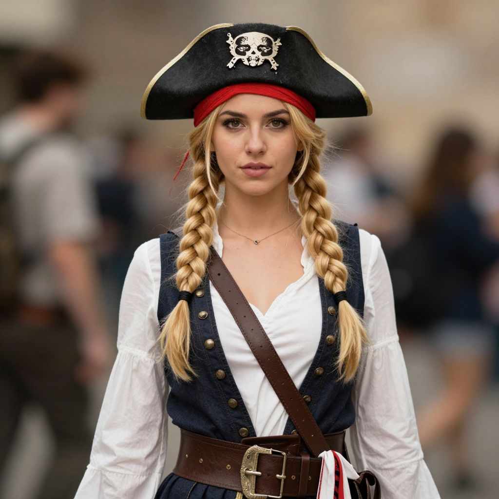 Young Woman in Authentic Pirate Costume with Tricorn Hat and Braids