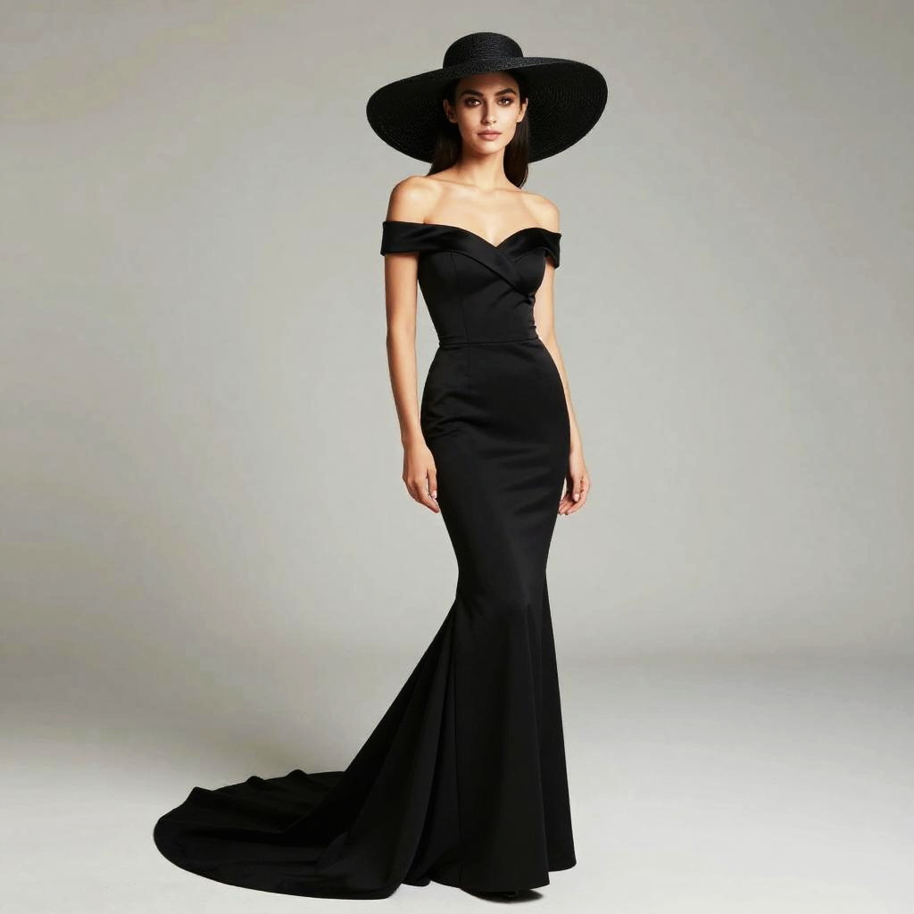A sophisticated woman models a sleek, off-the-shoulder black evening gown with a fitted bodice and a dramatic mermaid-style train. She complements the elegant look with a wide-brimmed black hat, set against a minimalist gray backdrop, embodying classic and timeless fashion.