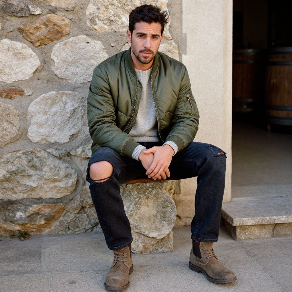 A man sits thoughtfully on a stone bench against a rustic stone wall, dressed in a casual yet stylish outfit featuring a green bomber jacket, gray sweater, and ripped black jeans. The natural outdoor setting and relaxed pose convey a laid-back, urban vibe.