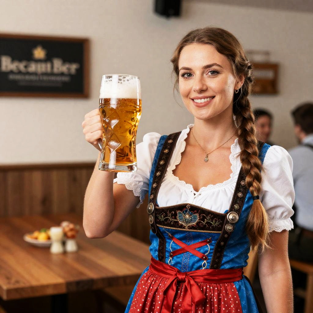 A cheerful woman dressed in a traditional Bavarian dirndl raises a large glass of beer in a warm and inviting beer garden setting. Her outfit features intricate embroidery and a vibrant red apron, embodying the spirit of Bavarian culture and Oktoberfest celebrations.