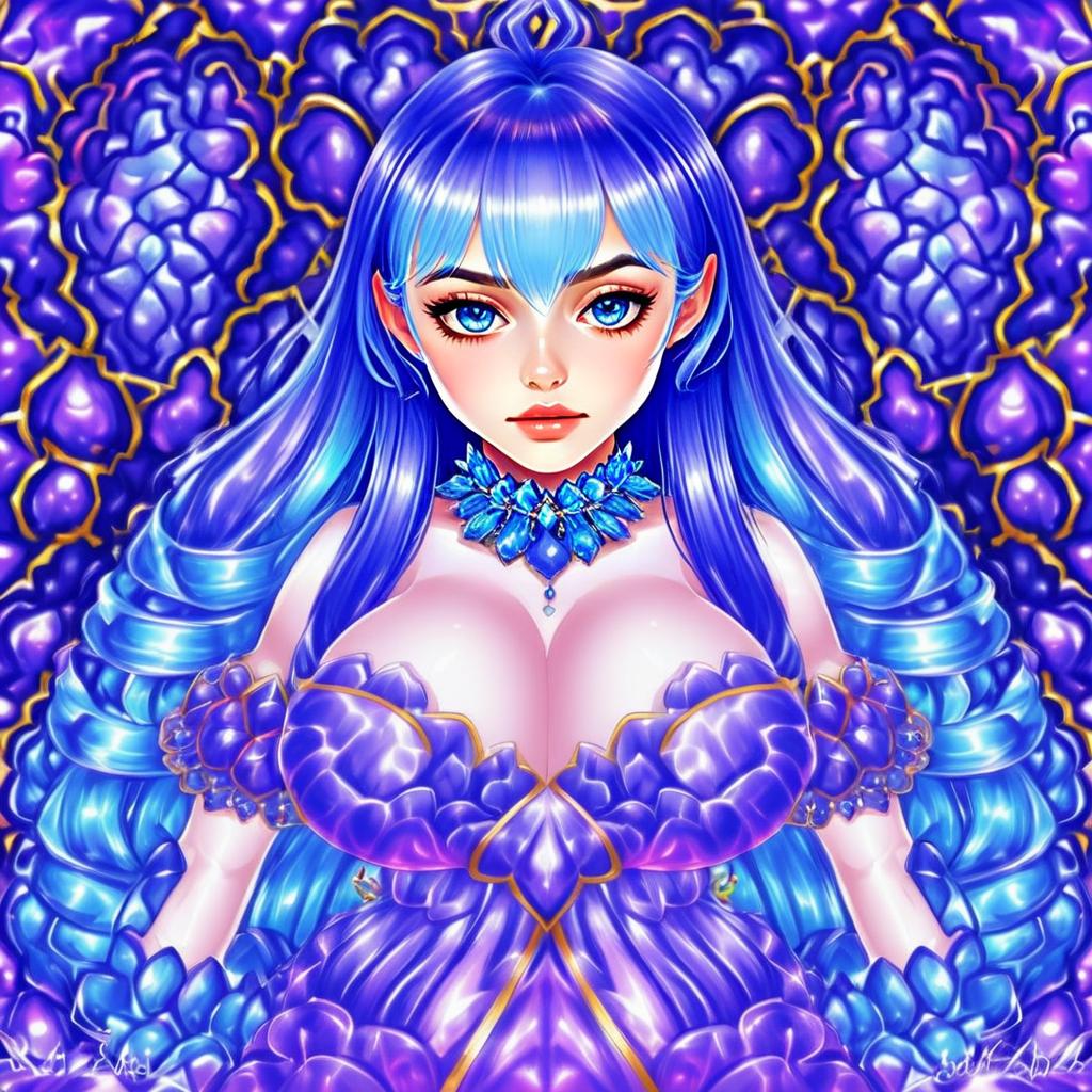 This vibrant anime-style illustration features a woman with striking blue hair and captivating blue eyes, dressed in a detailed, ornate purple outfit adorned with jewel-like accents. The artwork showcases a high level of digital painting skill with glossy, smooth textures and a richly decorated, symmetrical background that complements the central character's elegant pose.