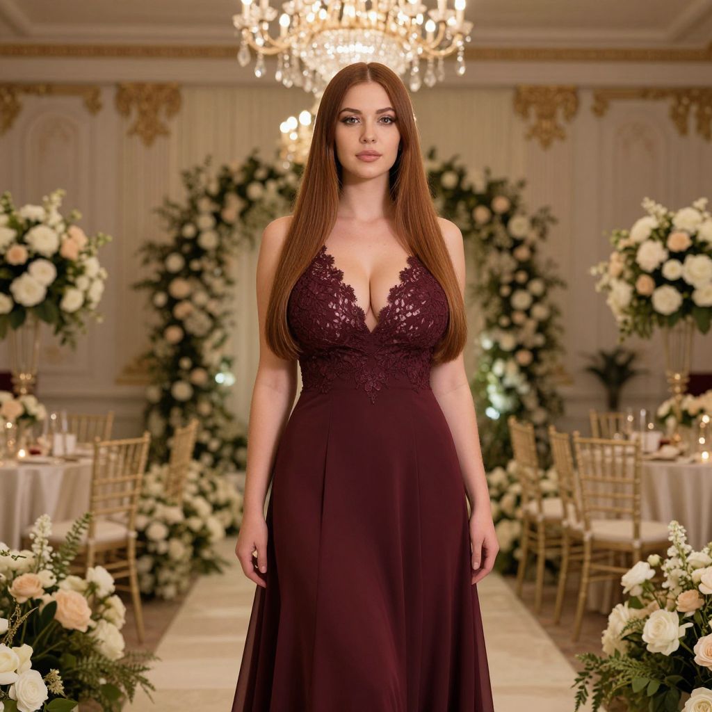 A woman with long straight auburn hair wears a sleeveless deep burgundy gown adorned with lace detailing on the bodice, standing confidently in an elegant, flower-filled ballroom setting. The background features golden chairs, white floral arrangements, and a sparkling chandelier, evoking a refined and romantic atmosphere.