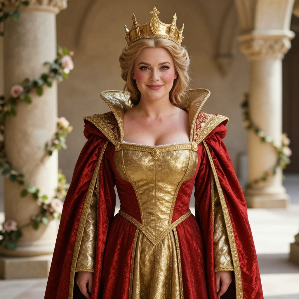 A woman dressed as a regal queen stands confidently in an ornate courtyard, wearing a luxurious gold and red gown with intricate brocade details and a matching golden crown. The image captures a classical renaissance-inspired style, highlighting elegance and royal authority.