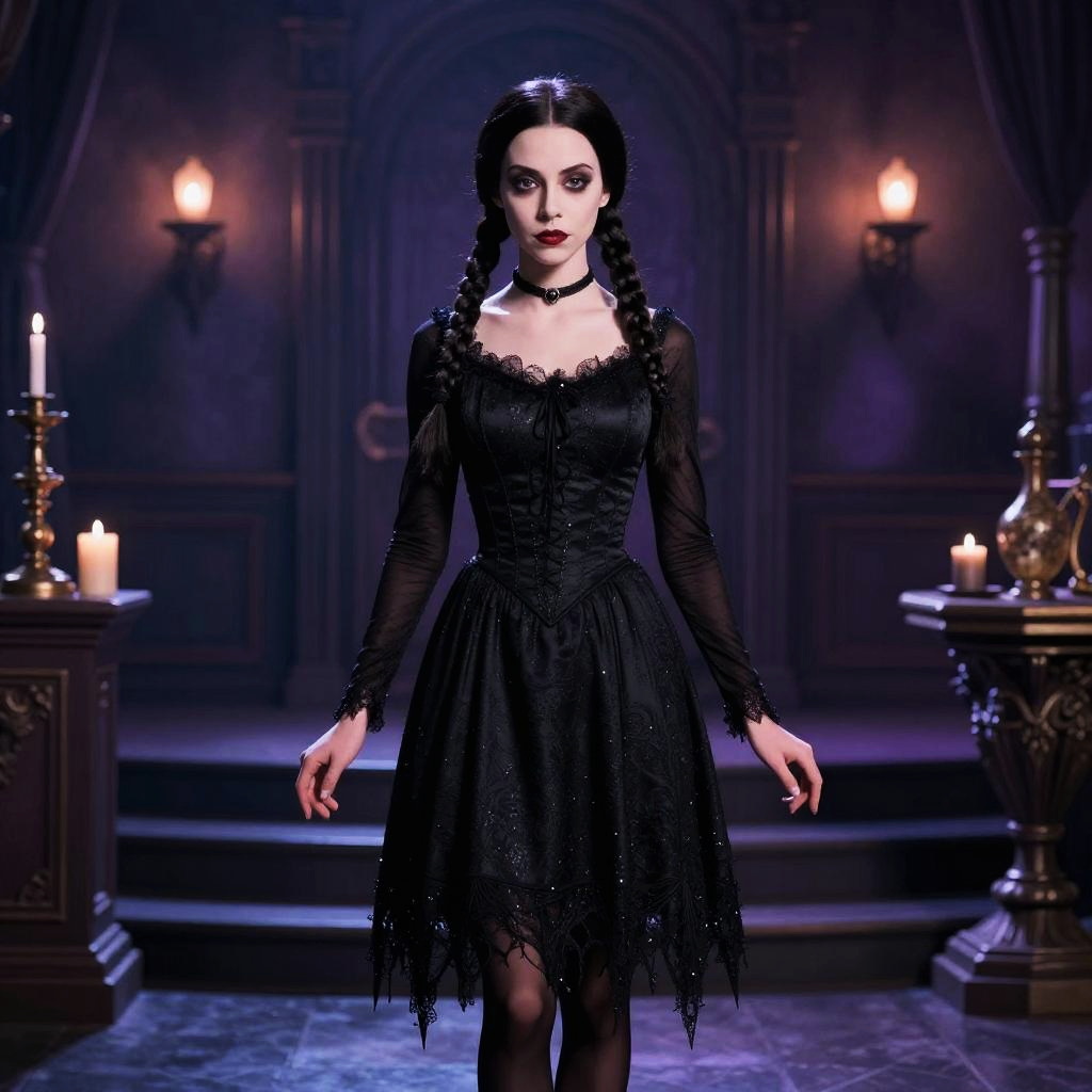 A woman dressed in a gothic, Wednesday Addams-inspired black dress stands in an elegantly dark room lit by candles. Her outfit features lace and sheer long sleeves, paired with braided hair and dark makeup, evoking a classic spooky yet refined aesthetic.