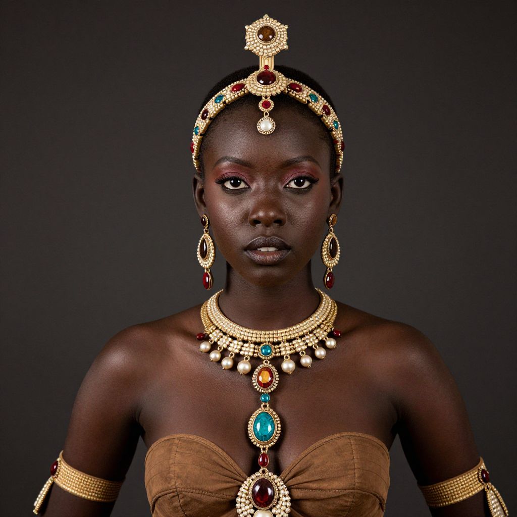 A striking portrait of a woman adorned with intricate traditional jewelry featuring gold, pearls, and colorful gemstones. The regal accessories include a detailed headband, statement earrings, and a layered necklace that complement her elegant and confident expression against a dark background.