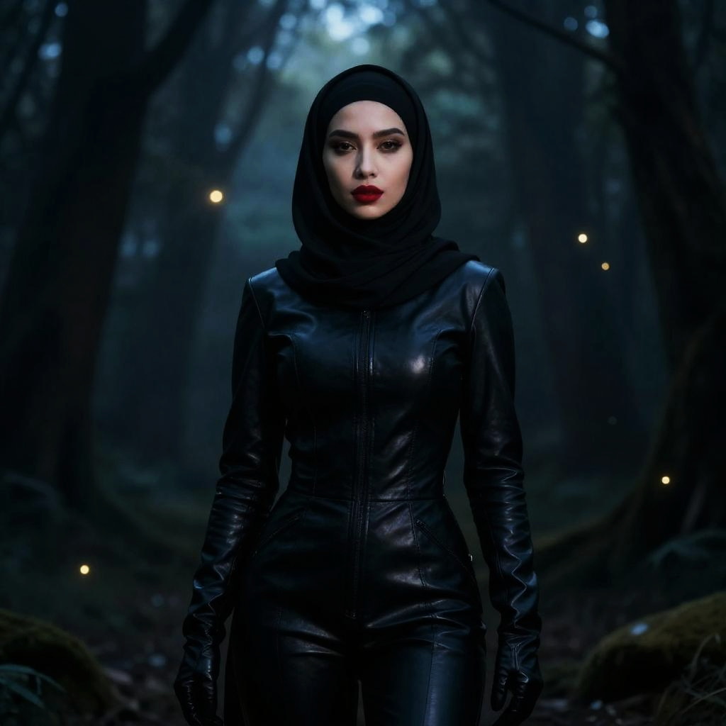 A confident woman dressed in a sleek black leather outfit and matching hijab stands in a mysterious, dimly-lit forest setting. Her bold red lipstick contrasts sharply with the dark, moody atmosphere, adding a touch of modern elegance to the enigmatic scene.