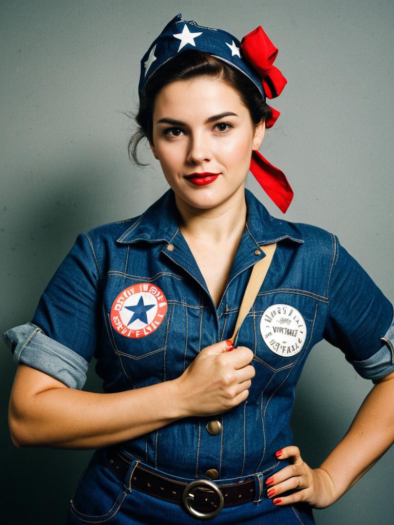 A confident woman dressed in a classic Rosie the Riveter costume, featuring a denim shirt adorned with patriotic patches and a star-spangled bandana with a red bow. The portrait captures the vintage style and empowerment associated with the iconic World War II cultural icon.