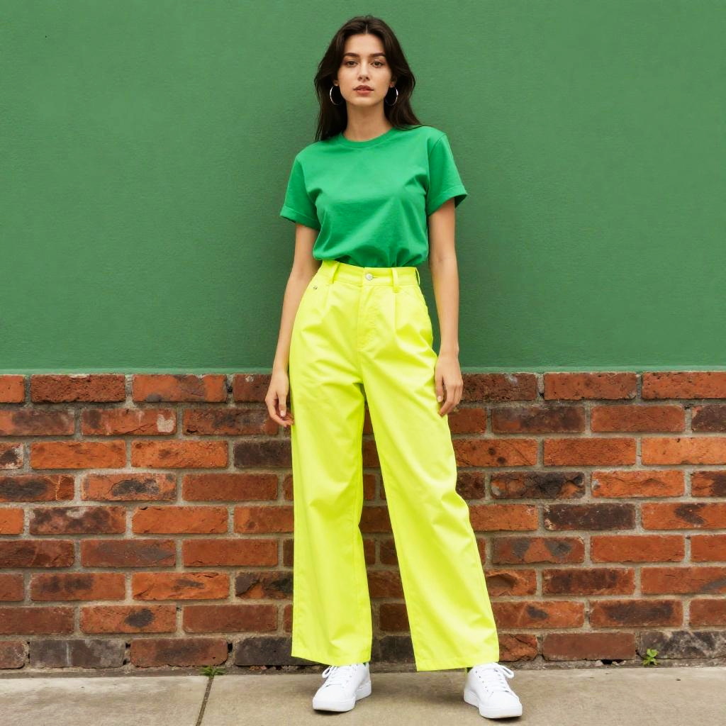 A young woman stands confidently against a green wall and brick background, dressed in a vibrant green t-shirt paired with bright yellow wide-leg pants and white sneakers. The image showcases a modern, bold, and colorful Gen Z-inspired fashion style with clean, minimal composition emphasizing vivid color contrasts.