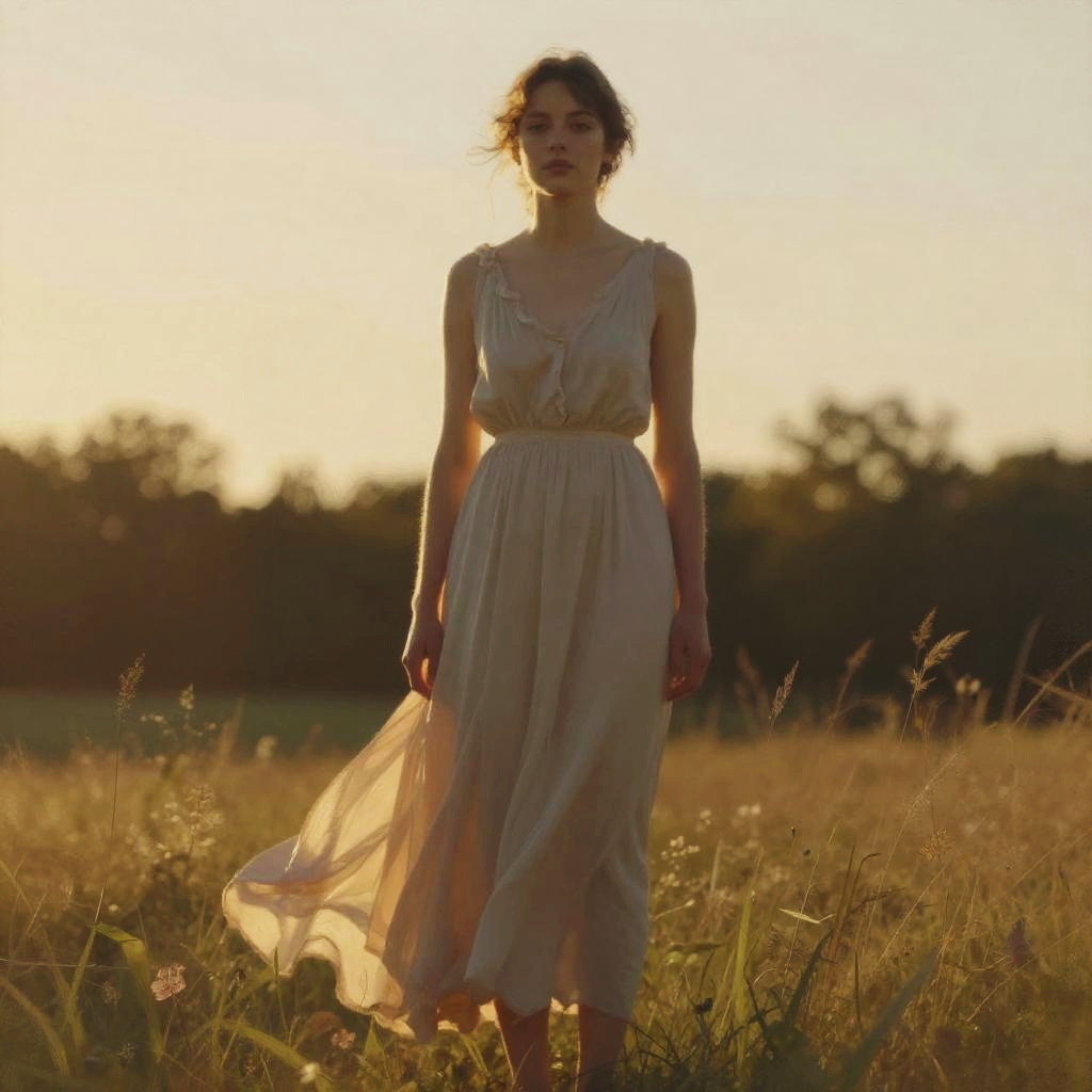 A young woman stands in a sunlit meadow during golden hour, wearing a flowing, light-colored dress that gently catches the breeze. The soft, natural lighting and serene outdoor setting evoke a dreamy, ethereal mood with a vintage or bohemian style aesthetic.