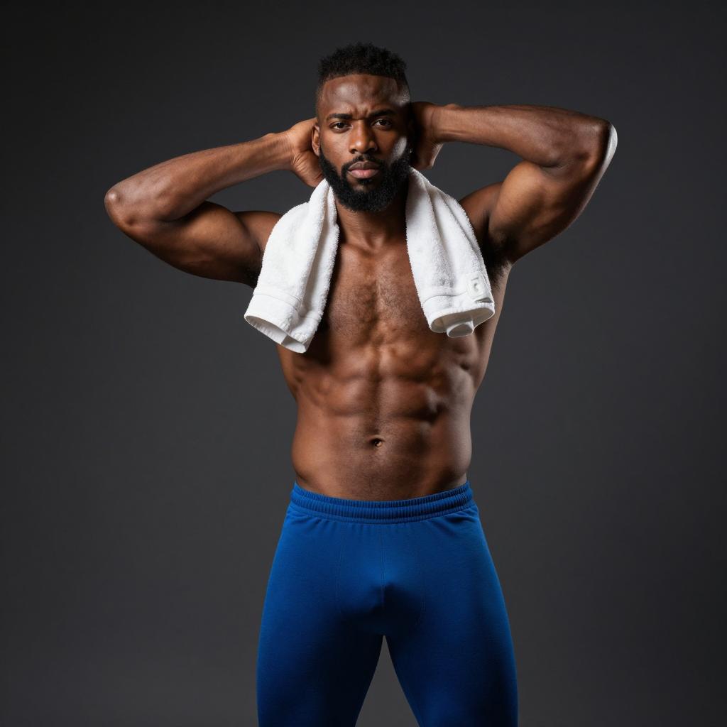 Fit Black Man with Towel and Blue Pants Fitness Portrait