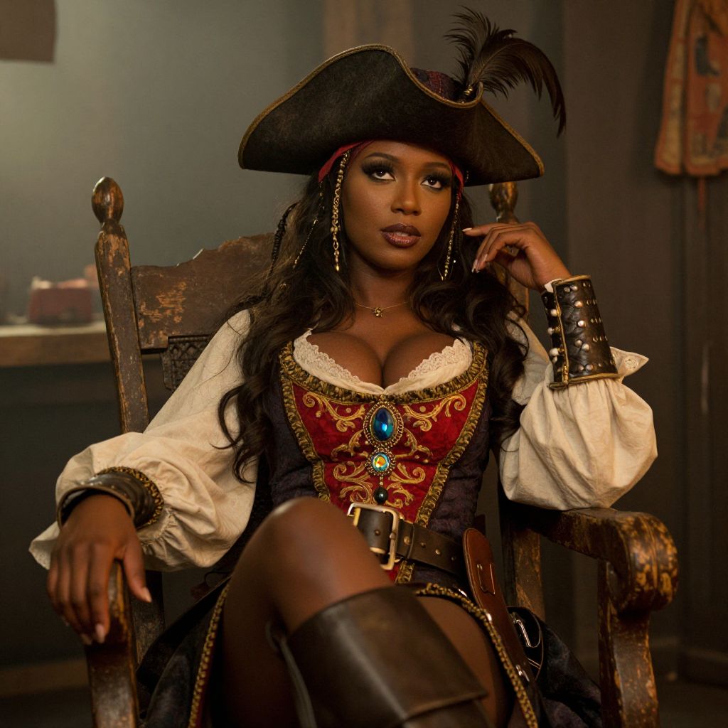 A confident woman dressed as a pirate captain sits regally in a rustic wooden chair, showcasing intricate 18th-century inspired pirate attire with ornate details and a feathered tricorn hat. Her commanding presence is accentuated by bold makeup and accessories, highlighting a dramatic and immersive historical costume style.