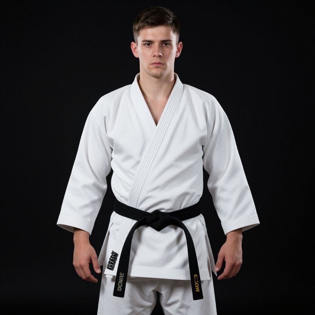 A focused young man stands confidently wearing a traditional white martial arts gi and a black belt, symbolizing his advanced skill level. The image is shot against a solid black background highlighting the texture and details of the gi in a studio setting.