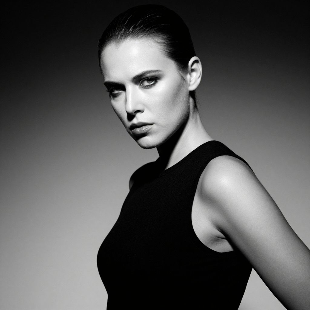 A striking black and white portrait of a woman with slicked-back hair, wearing a sleeveless black top. The high-contrast lighting emphasizes her sharp facial features and conveys a mood of confidence and intensity in a classic fashion photography style.