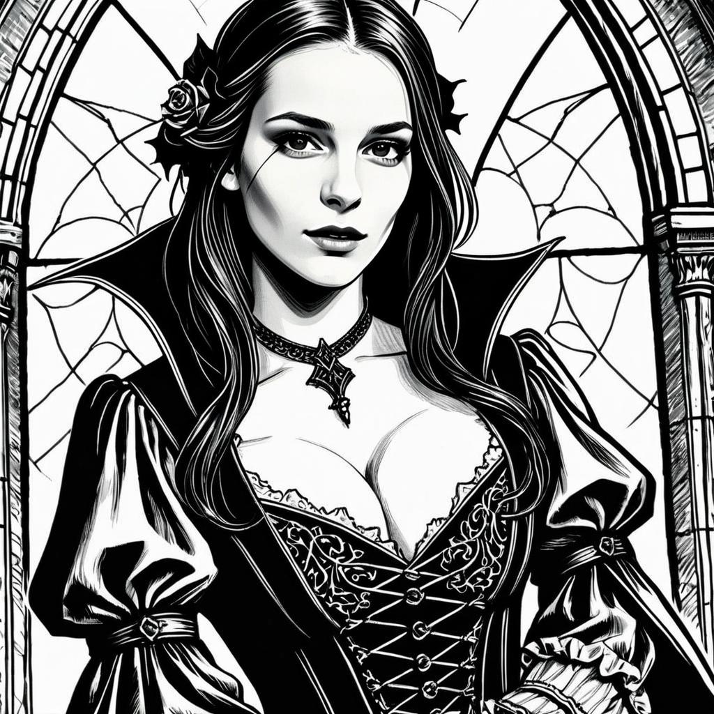 This black and white digital illustration features a woman dressed in an elaborate gothic vampire costume with intricate lace details, a high collar, and a choker necklace. The art style is highly detailed with strong contrasts and a comic book or graphic novel aesthetic, set against a backdrop of cracked stained glass windows.