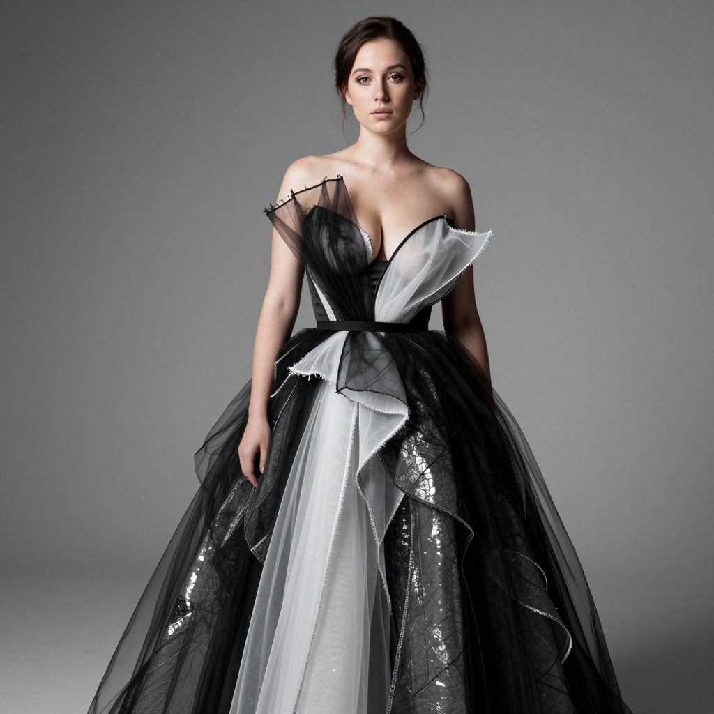 A woman stands confidently wearing an elegant black and white evening gown featuring intricate layers of tulle and a shimmering textured skirt. The strapless dress combines modern haute couture design with dramatic volume and asymmetrical detailing against a neutral gray background.