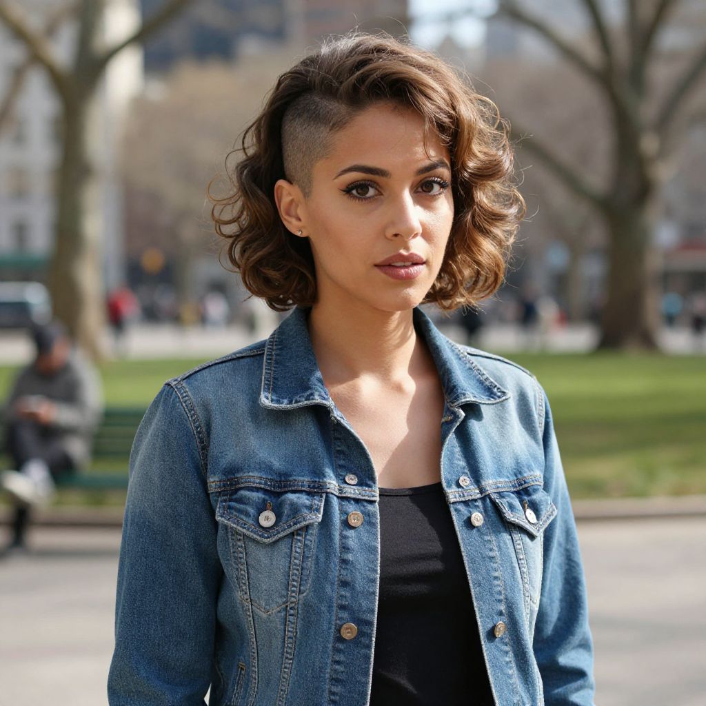 Confident Woman with Curly Bob and Shaved Side Wearing Denim Jacket Outdoors