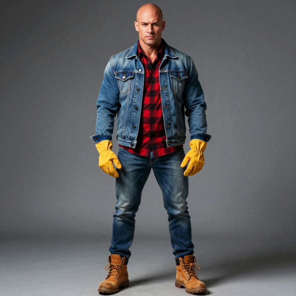 A confident bald man stands against a gray background wearing a rugged denim jacket paired with a red and black plaid shirt, blue jeans, and yellow work gloves. His sturdy brown boots complement the outdoorsy, workwear style that conveys strength and readiness.