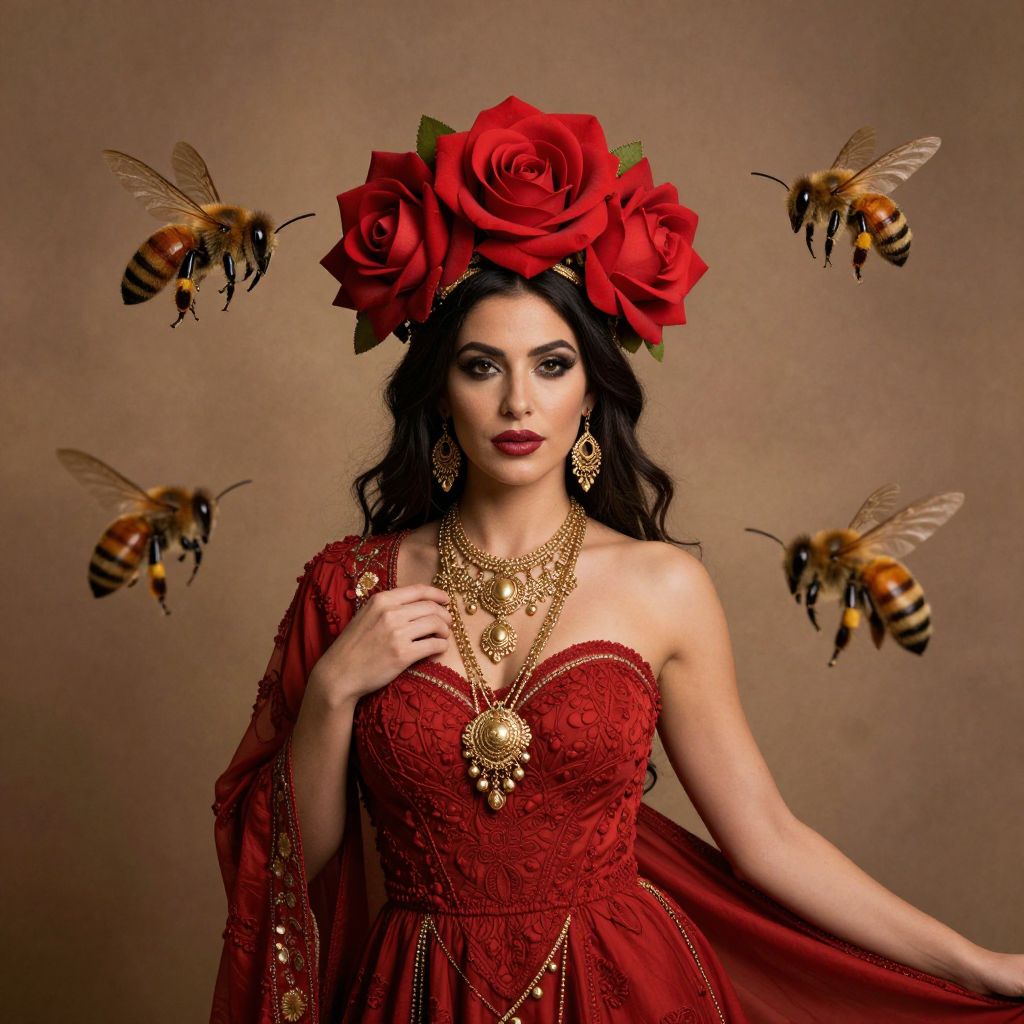 A striking woman dressed in an intricately embroidered red gown adorned with multiple layers of gold jewelry poses gracefully against a neutral background. She wears a dramatic headpiece featuring large red roses, surrounded by four hovering bees, creating a surreal and elegant composition with a classical portrait style.