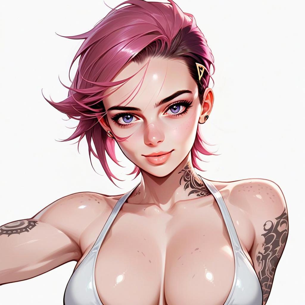 This vibrant digital illustration features a confident young woman with short, pink hair and striking purple eyes, rendered in a hyper-realistic anime style. She sports intricate black tattoos on her neck and arms, wearing a white halter top that accentuates her athletic figure. The artwork combines detailed shading and smooth gradients, highlighting the glossy finish on her skin and the dynamic flow of her hair.