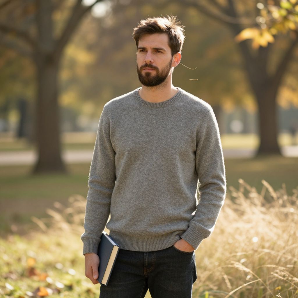 A serious young man stands outdoors in a park setting, dressed in a casual gray sweater and holding a closed book in one hand, with the other hand in his pocket. The warm sunlight and autumn foliage in the background create a serene and contemplative atmosphere.