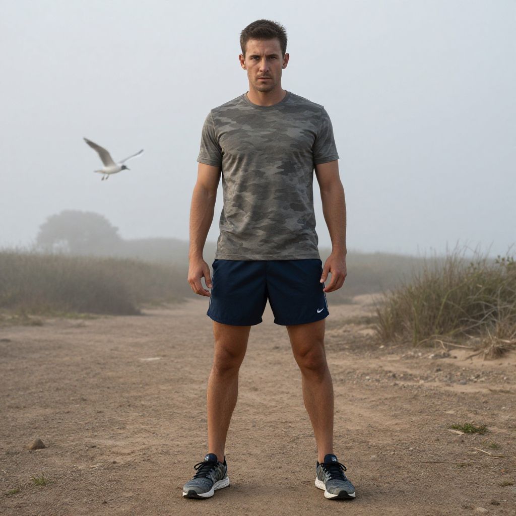 A man stands confidently on a foggy dirt path surrounded by low vegetation, wearing a grey camouflage t-shirt, navy blue shorts, and running shoes. The muted background and seagull in mid-flight add a natural and serene outdoor atmosphere to the image.