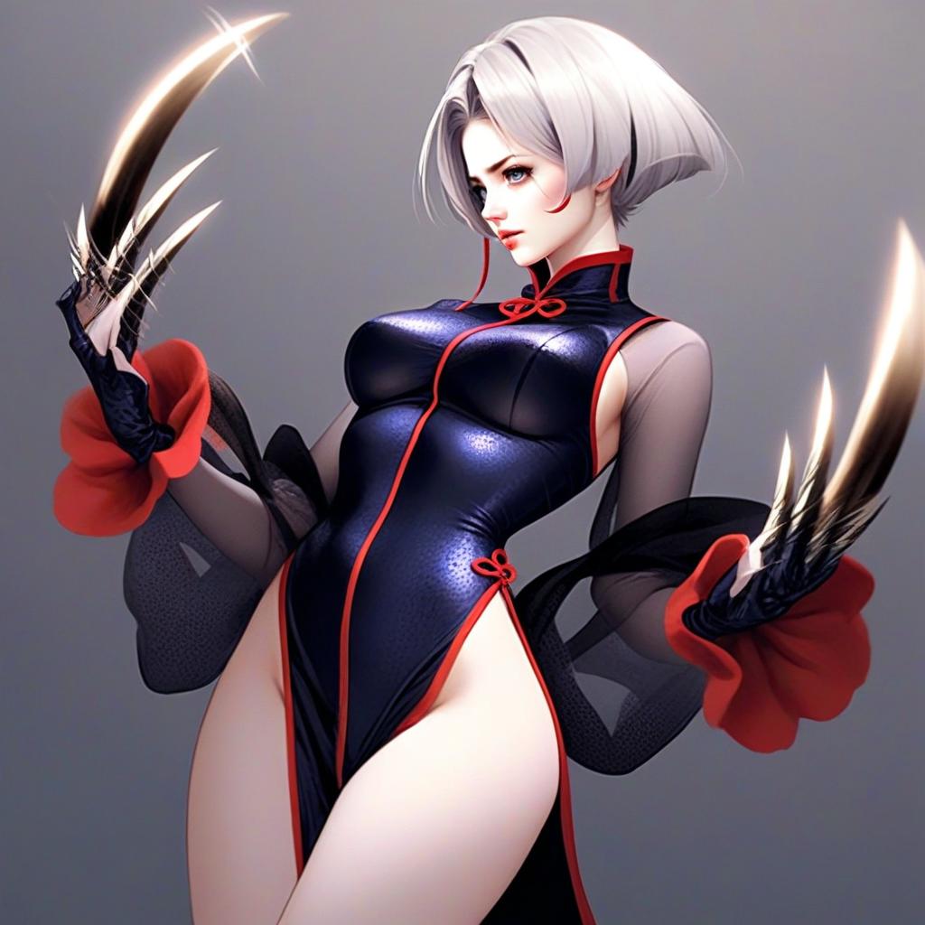 This digital artwork features a striking woman inspired by the Street Fighter character style, dressed in a sleek, dark high-slit outfit with red accents and sheer sleeves. She wields large, sharp claw-like weapons emitting a glowing effect, emphasizing her fierce and powerful persona in a modern anime-inspired style.